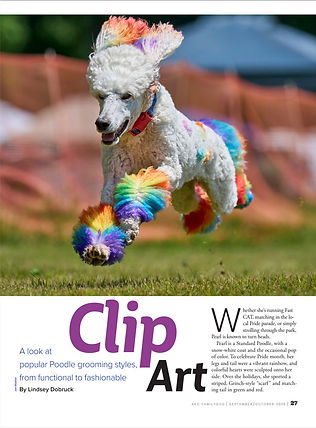 Spike Dog Grooming and groomer, Liz Jackson, were featured in AKC Family Dog Magazine ( Issue- September/October 2025). In the article "Clip Art", which dives deep into the history of poodle grooming, Liz's creative colorwork can be seen on Pearl the standard poodle as she runs FastCat!